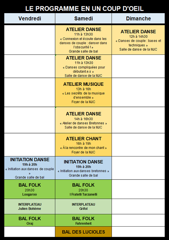 Précision pour 2025 : Alors que la première édition du Bal des Lucioles s’est déroulée dans une ambiance sonore typée «world» et tribale, que la seconde édition s’est faite dans une ambiance «fusion», les morceaux qui seront proposés cette année seront dans la pure esthétique trad et néo-trad !